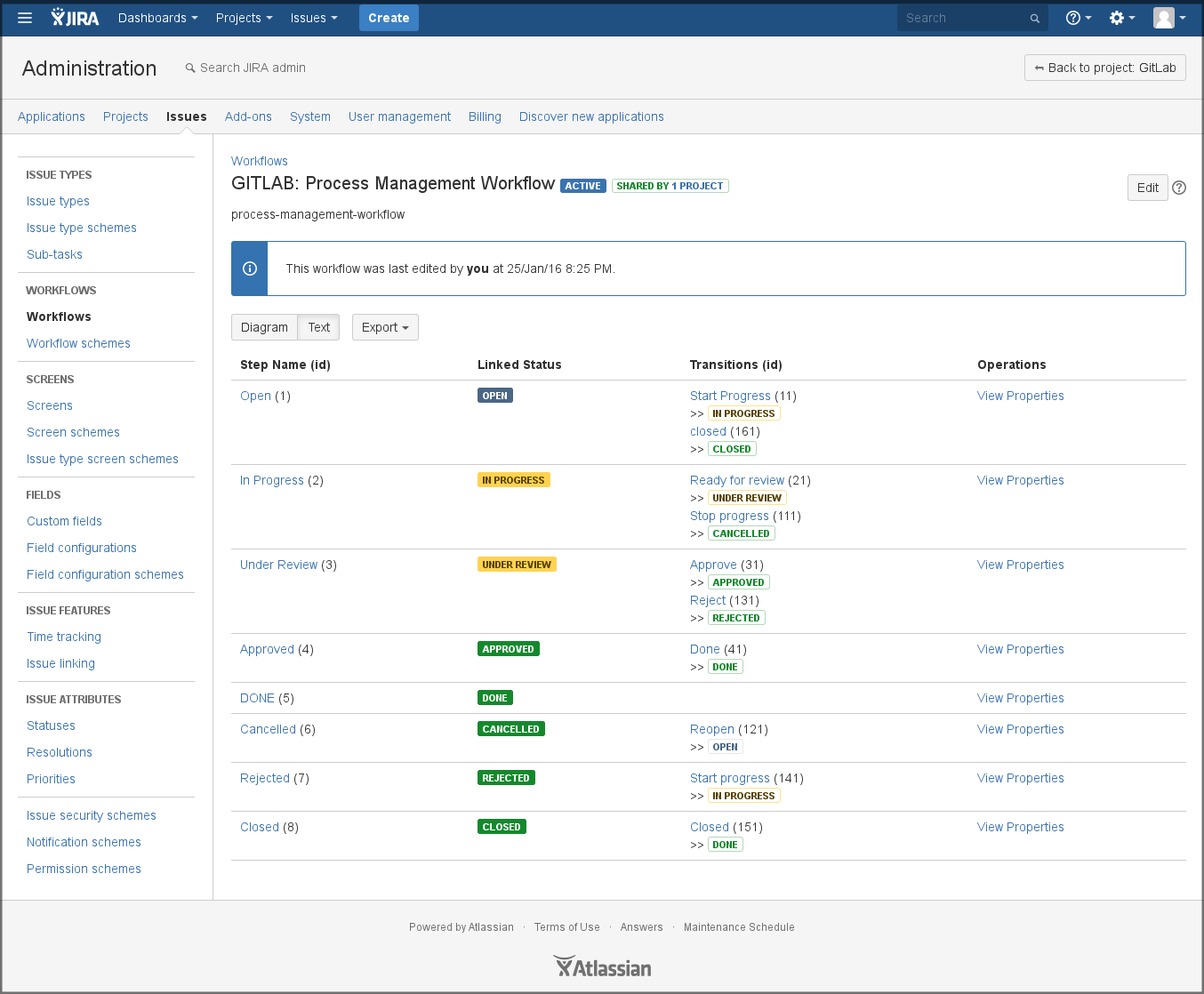 JIRA issue transition This setting is very important to set up correctly. It is the ID of a transition that moves issues to a closed state. You can find this number under the JIRA workflow administration (Administration > Issues > Workflows) by selecting View under Operations of the desired workflow of your project. The ID of each state can be found inside the parenthesis of each transition name under the Transitions (id) column (see screenshot). By default, this ID is set to 2.